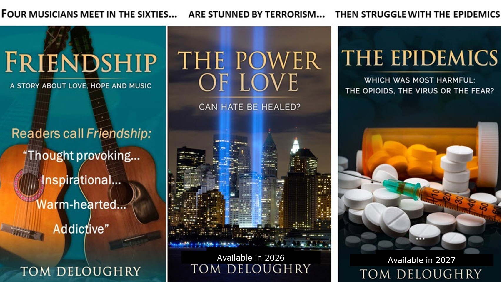 The third novel, The Epidemics, focus on the epidemics of opioids, COVID and fear in the years that lead up to the 2026 New York State Gubernatorial Election, as Donna’s granddaughter, Alice, heads the communications team supporting the 2028 presidential candidacy of Peter Rudolph (Susan’s former lover, known as the billionaire “Chicken King” in the national medial.) She collaborates with Paul and Susan to develop a statewide public health proposal that uses music and mindfulness to reduce fear – which they (and I) think is the most harmful epidemic – while encouraging voters and other politicians to endorse the Charter for Compassion – adopted by over 120 municipalities around the world.